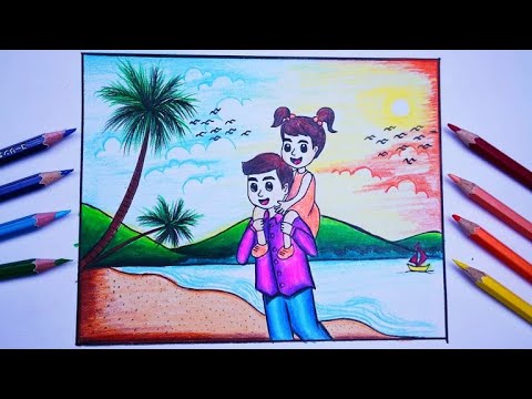 วาดภาพพ่อลูกเที่ยวทะเลวันพ่อแห่งชาติด้วยสีไม้ | How to draw father's day - วาด ระบายสี ระบายสี วัน พ่อ